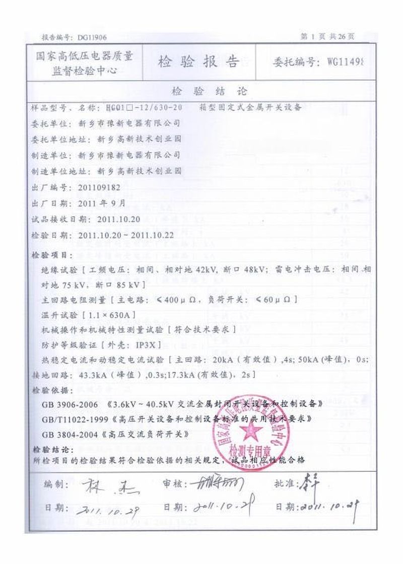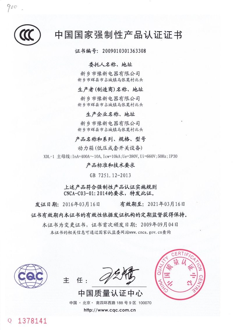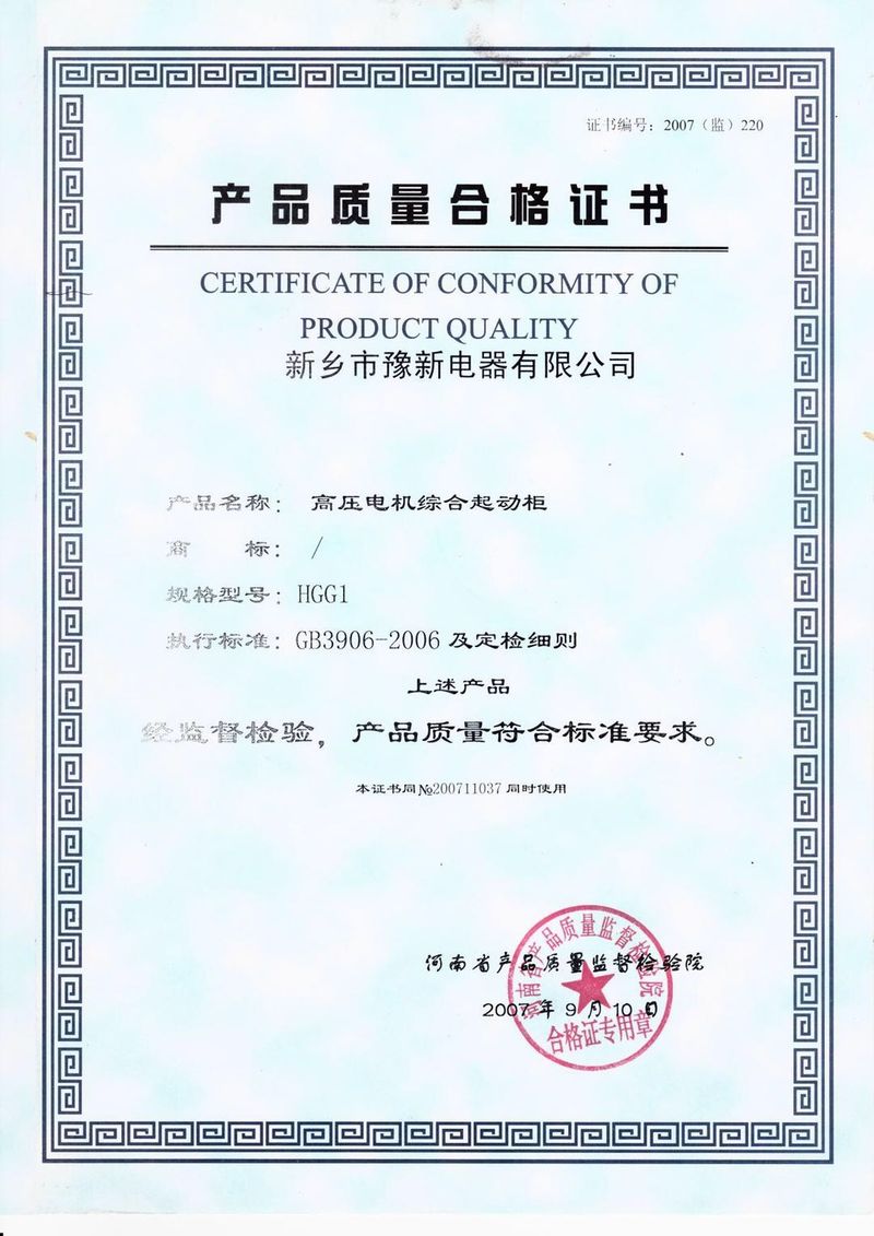 已通過(guò)ISO9000國(guó)際質(zhì)量管理體系認(rèn)證;產(chǎn)品注冊(cè)‘豫新’牌商標(biāo),低壓動(dòng)力控制柜通過(guò)國(guó)家強(qiáng)制性CCC認(rèn)證,低壓降壓?jiǎn)?dòng)柜曾經(jīng)天津低壓電器研究所、蘇州電器研究所有限公司檢測(cè)合格
